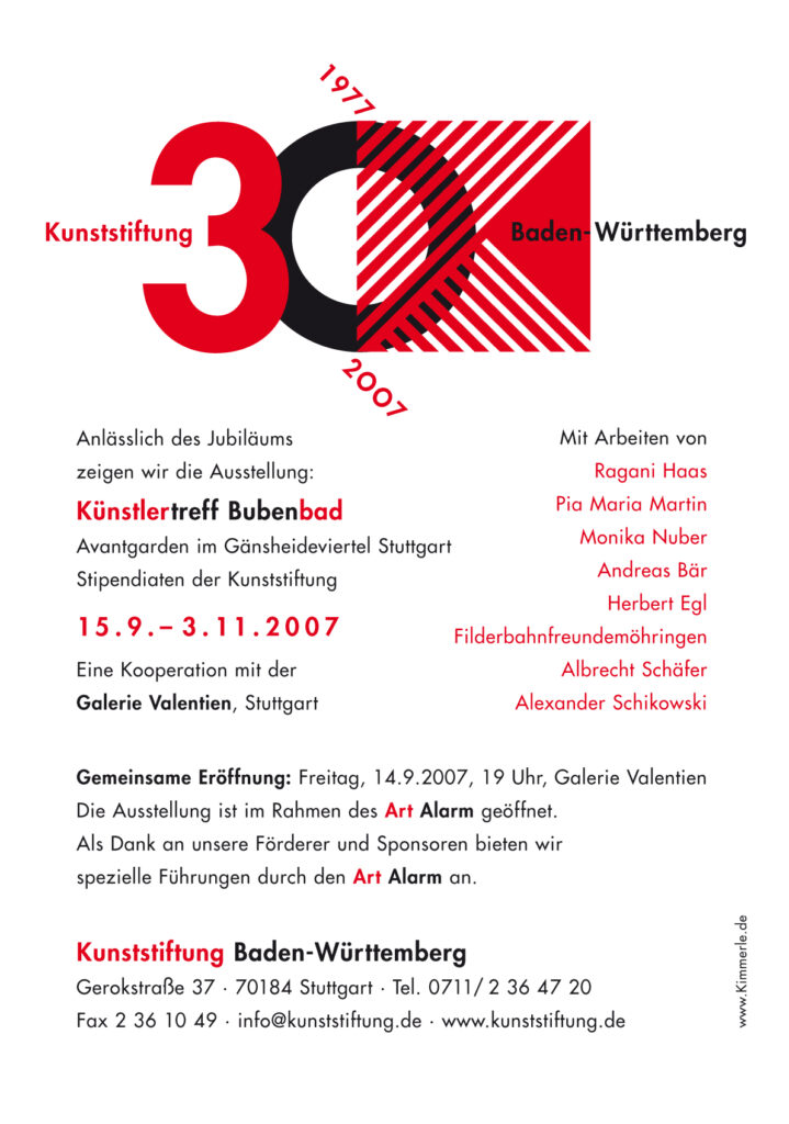 Titel: 30 Jahre Jubiläum Jahr: 2007 Kategorien: Kulturkommunikation Auftraggeber: Kunststiftung Baden-Württemberg Autor: Petra v. Olschowski Gestaltung: Michael Kimmerle Untertitel: Umschlag Katalogheft Untertitel: Einladung Untertitel: Anzeige