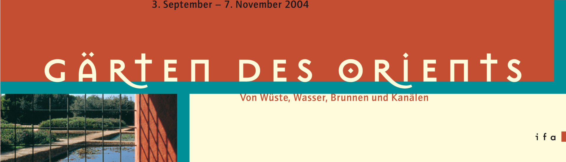 Titel: Gärten des Orients – ifa-Ausstellung Jahr: 2004 Kategorien: Kulturkommunikation, Plakat Auftraggeber: Institut für Auslandsbeziehungen Autor: Iris Lenz Foto: Laurence Toussaint Gestaltung: Michael Kimmerle Untertitel: Plakat Untertitel: Katalog-Cover Untertitel: Displaywand