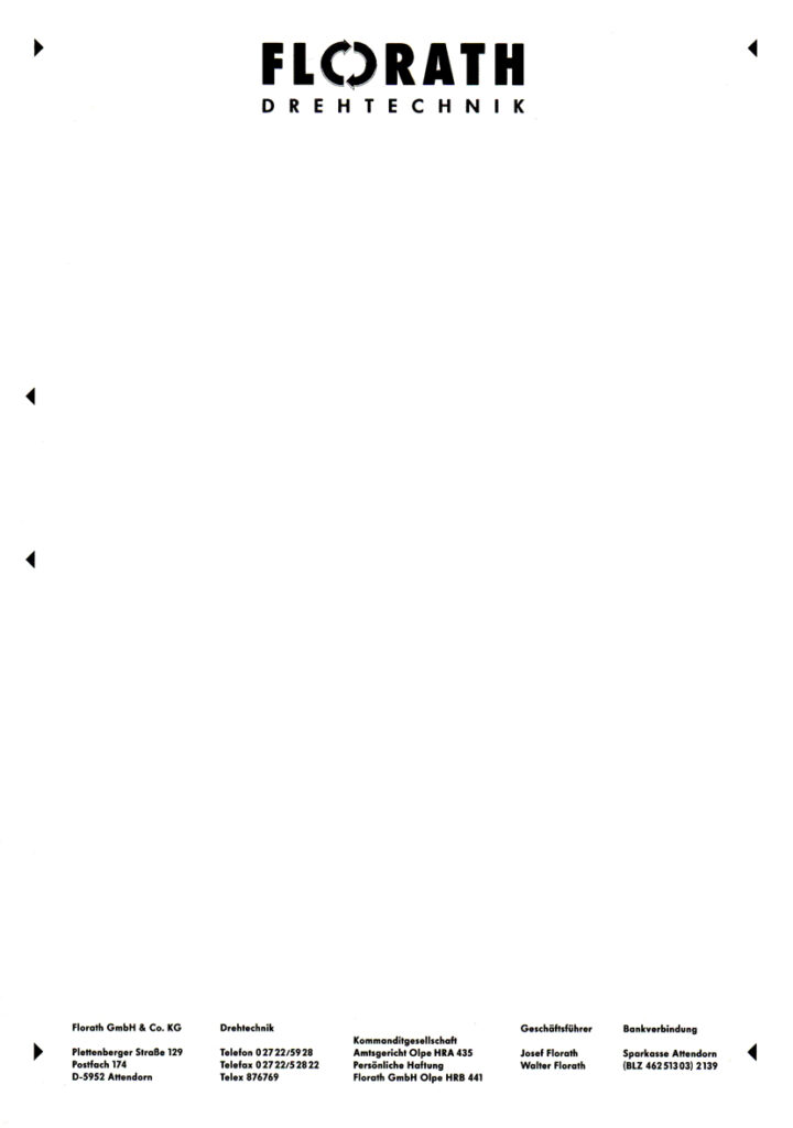 Titel: Florath – Geschäftsausstattung Jahr: 1989 Kategorien: Corporate Design, Logo / Piktogramm Auftraggeber: Florath, Attendorn Foto: Dieter Elsässer Gestaltung: Michael Kimmerle Untertitel: Logo Untertitel: Prospekt-Titel Untertitel: Visitenkarte mit Folienprägung Untertitel: Briefbogen